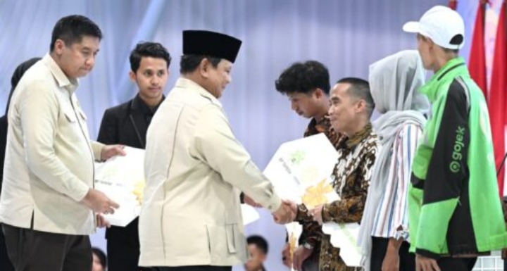 Presiden Prabowo Subianto serahkan kunci rumah kepada perwakilan masyarakat pada acara Akad Massal 50.030 Unit KPR Sejahtera FLPP dan Serah Terima Kunci Tahun 2025, di Perumahan Pondok Banten Indah, Kota Serang, Provinsi Banten, Sabtu, 20 Desember 2025. Foto: BPMI Setpres/Kris