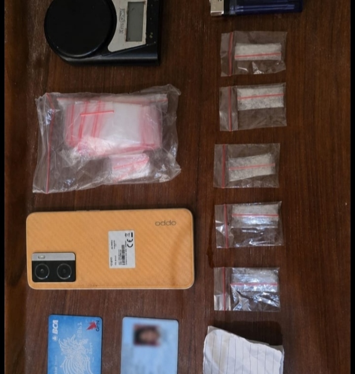 Petugas melakukan penggeledahan dengan disaksikan oleh tokoh masyarakat setempat. Selain lima paket sabu dengan berat bruto 4,02 gram, polisi juga menyita sejumlah barang bukti pendukung lainnya seperti timbangan digital, satu pak plastik klip transparan, handphone, dan korek api modifikasi.