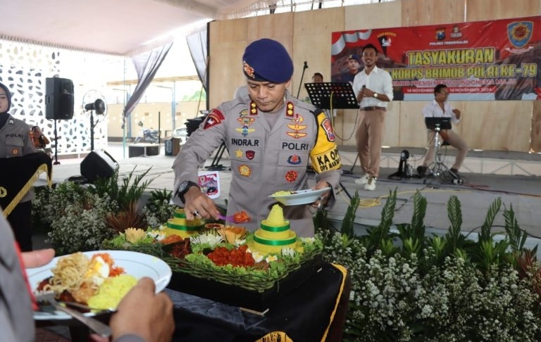 Kapolres Trenggalek AKBP Indra Ranu Dikarta, yang juga pernah cukup lama berdinas di satuan elit Polri tersebut berkenan memotong tumpeng sebagai wujud rasa syukur dan menyerahkan kepada perwakilan dari anggota eks Brimob yang hadir.