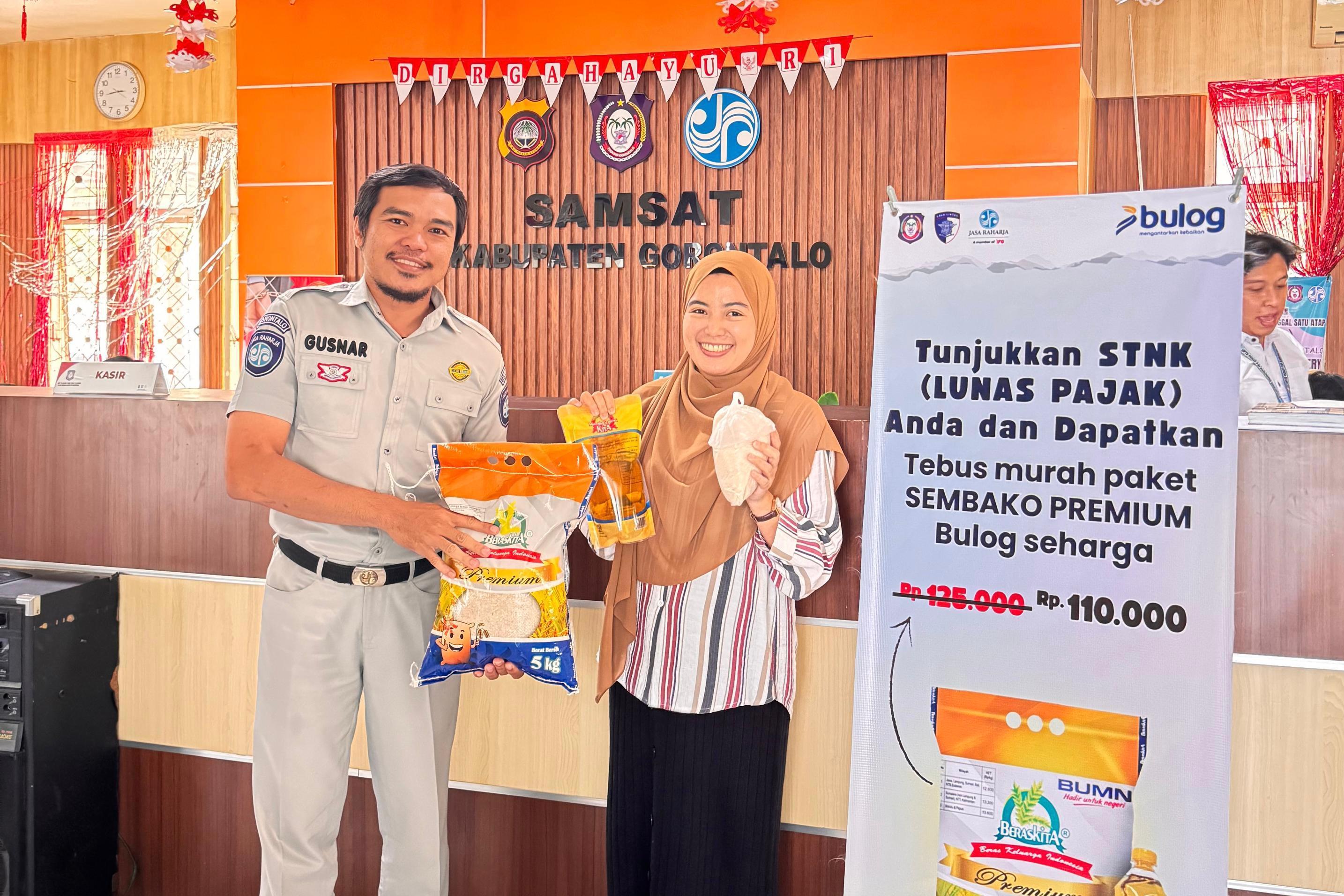 Selain itu, Perum Bulog Cabang Gorontalo juga memberikan paket sembako harga khusus bagi wajib pajak yang lunasi pajak kendaraan. Hingga kini, 150 voucher paket sembako telah digunakan, dengan distribusi bahan pangan lebih dari satu ton sejak Februari hingga Oktober 2025.