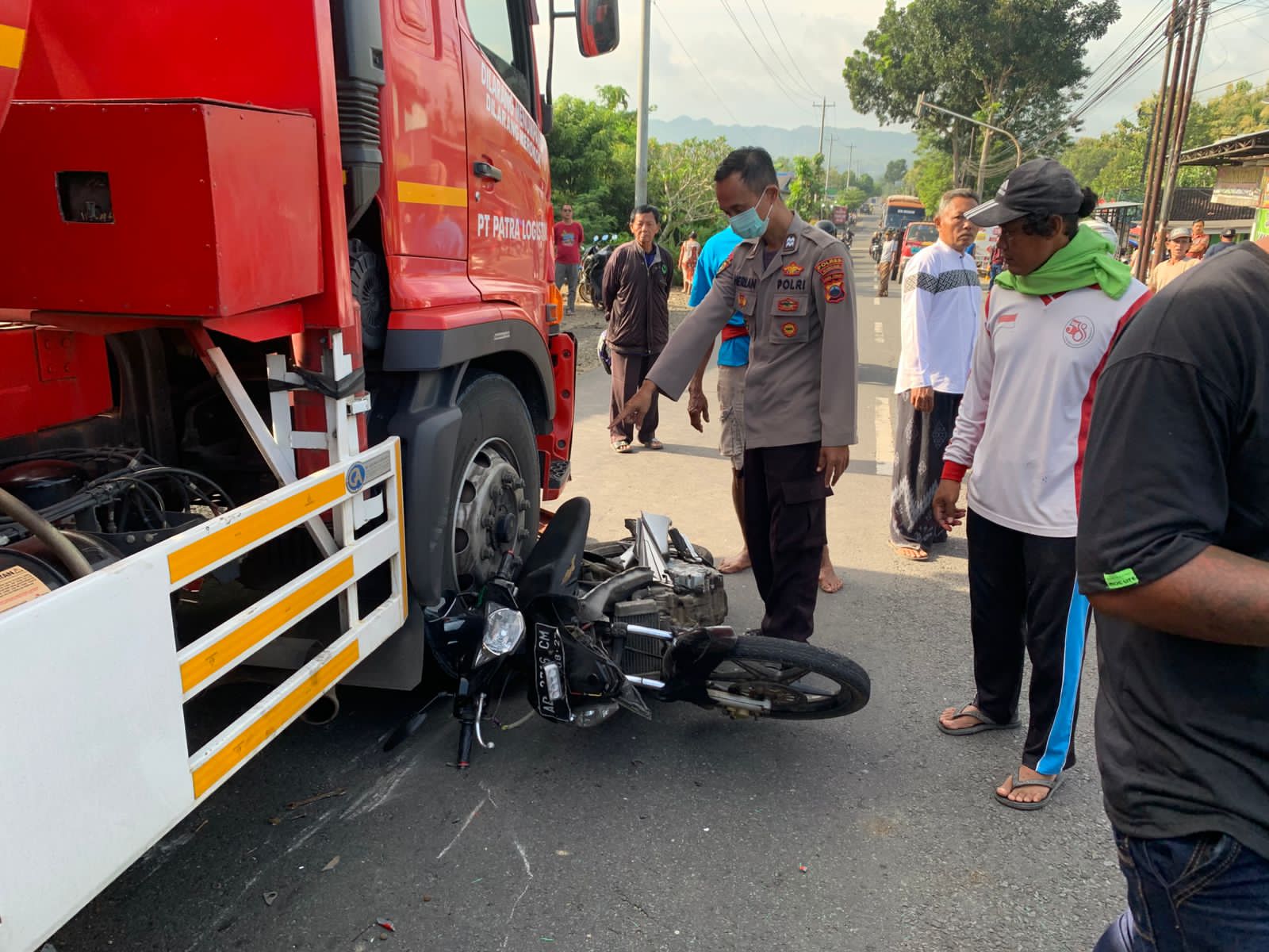 Pada saat bersamaan, dari arah utara melaju truk tangki BBM yang berada di belakang sepeda motor Yamaha Mio. Karena jarak yang sudah terlalu dekat, pengemudi truk tidak dapat menghindar sehingga menabrak pengendara Yamaha Jupiter MX yang terjatuh di badan jalan. Akibatnya, korban mengalami luka berat di kepala dan meninggal dunia di tempat kejadian.
