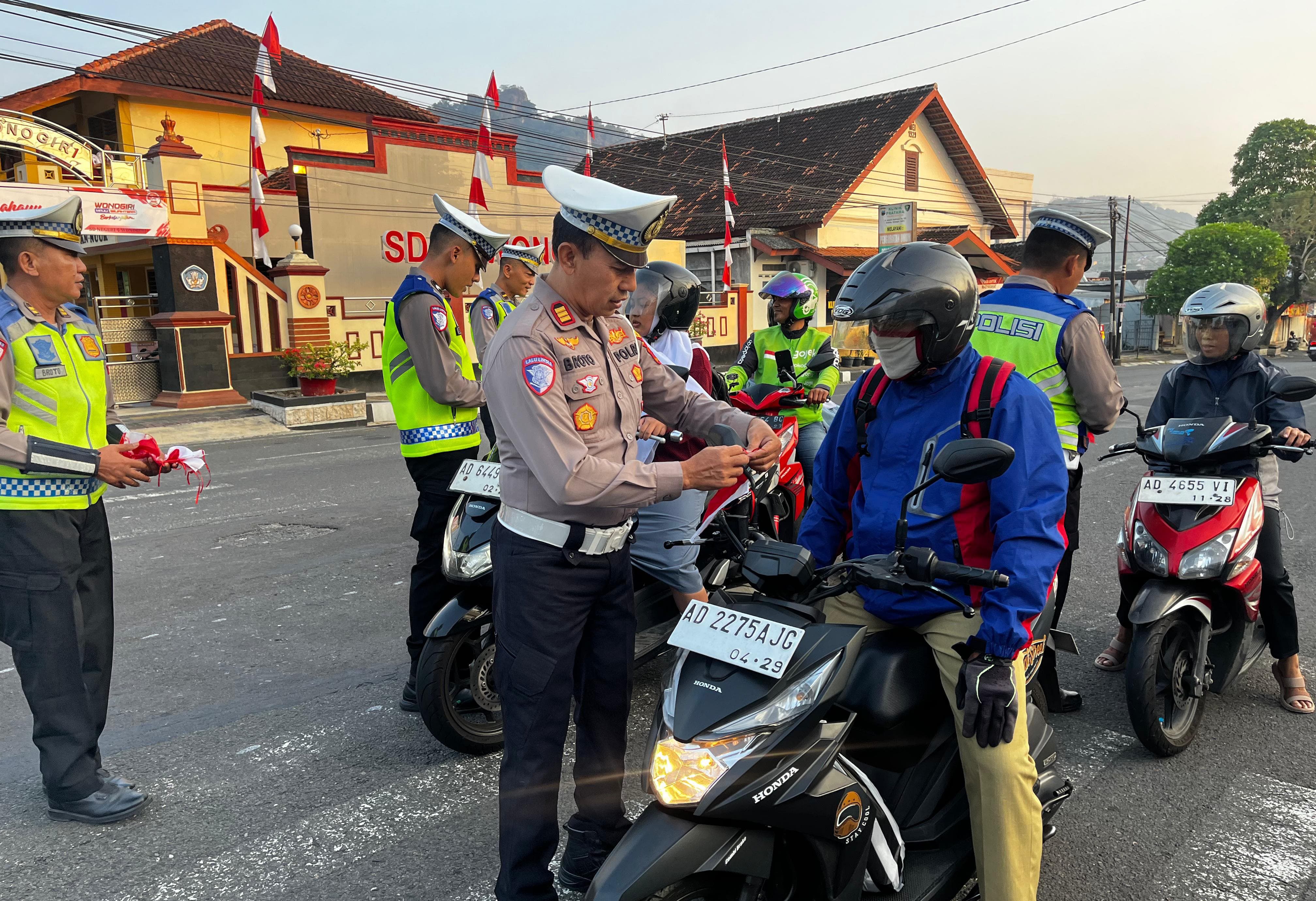 PanselaNews.com [WONOGIRI]– Menyambut peringatan Hari Kemerdekaan Republik Indonesia ke-80, Satuan Lalu Lintas [Sat Lantas] Polres Wonogiri menggelar kegiatan “Polantas Menyapa” dengan membagikan dan memasang bendera Merah Putih kepada pengguna jalan, Senin, 11 Agustus 2025.