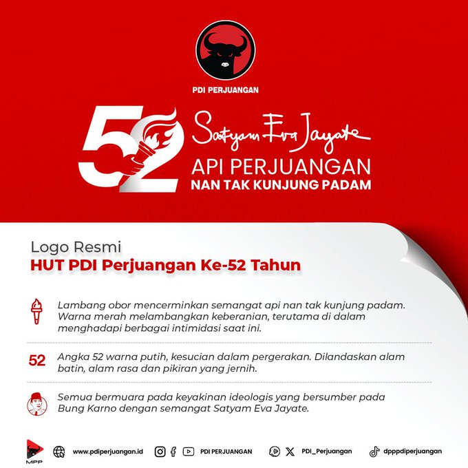 52 tahun bukanlah waktu yang singkat. Selama periode tersebut, PDI Perjuangan telah melewati banyak suka dan duka, berupaya keras untuk terus memperjuangkan kepentingan rakyat dan memajukan bangsa. Logo baru ini menampilkan simbol api yang menggambarkan semangat yang tak pernah padam, mencerminkan dedikasi partai untuk membawa perubahan dan kemajuan.