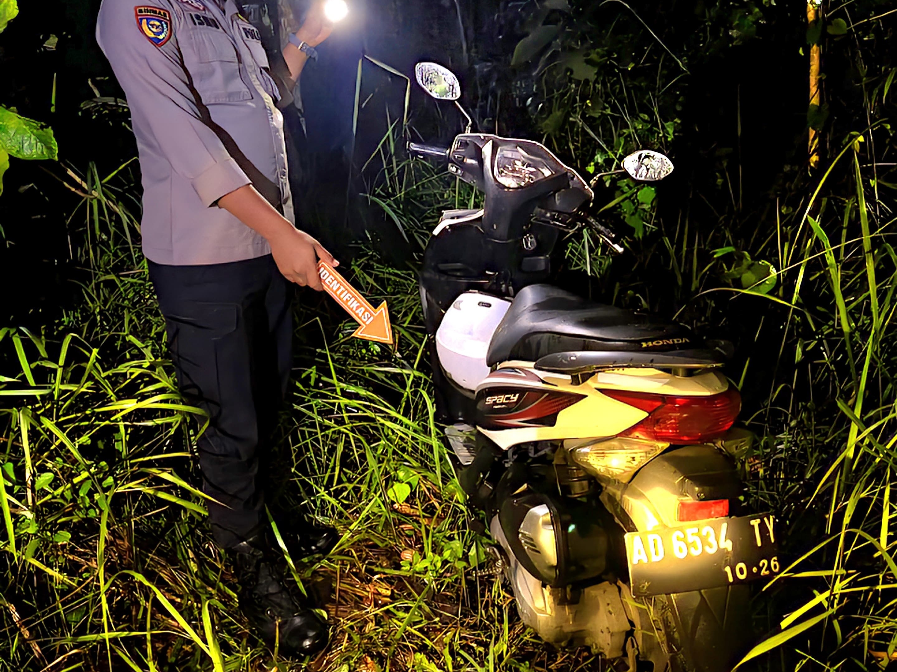 Sepeda motor jenis Honda Spacy warna hitam putih dengan nomor polisi AD–6534-TY tersebut ditemukan di jalan penghubung antara Dusun Pakel dan Dusun Kamplong, tepatnya di wilayah Desa Ngadipiro, Kecamatan Nguntoronadi, Kabupaten Wonogiri, sekitar pukul 20.00 WIB.