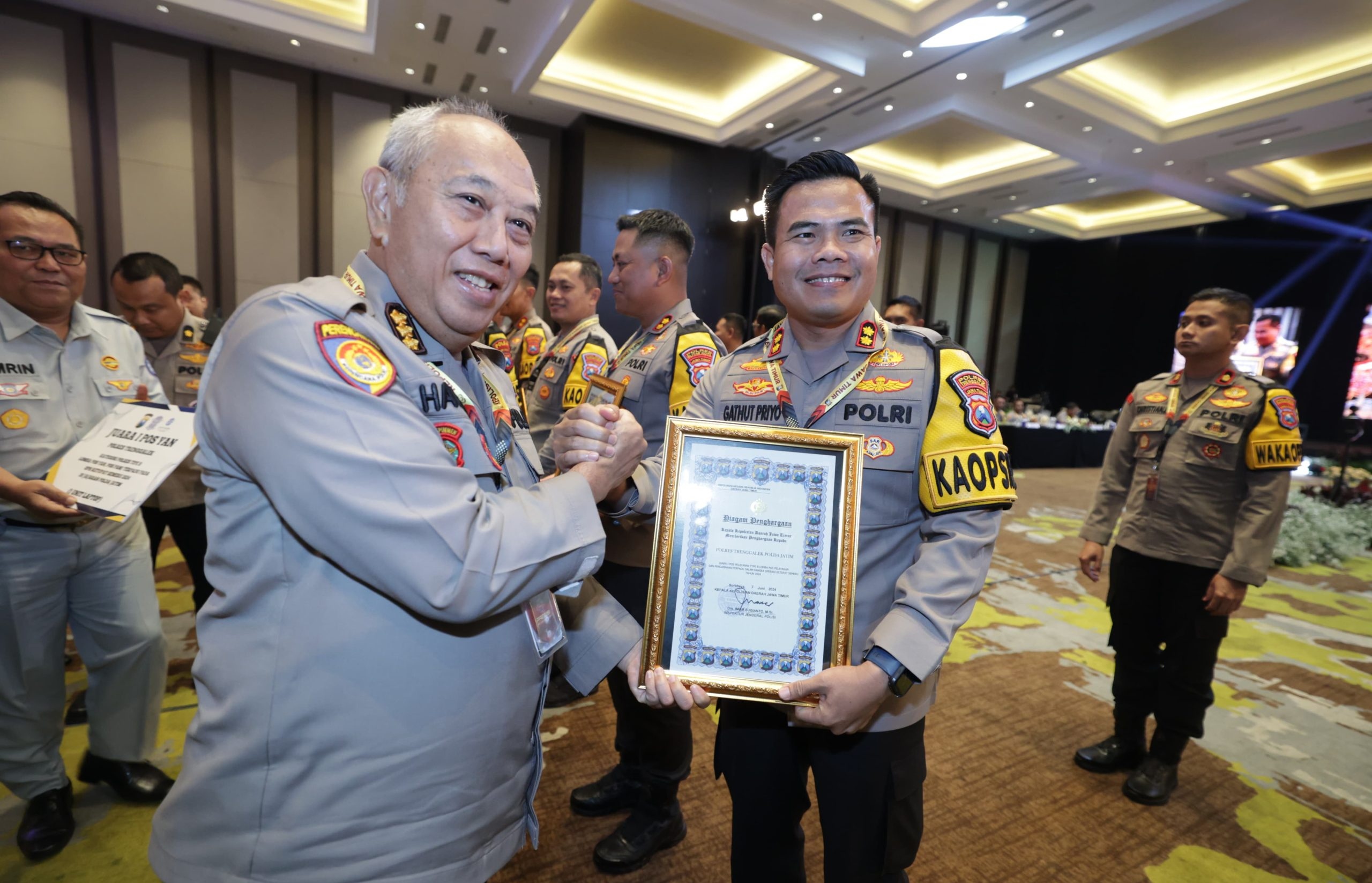 Penghargaan diserahkan langsung oleh Kapolda Jatim Irjen Pol Drs. Imam Sugianto M. Si. bersamaan dengan digelarnya kegiatan analisa dan evaluasi (Anev) Kamtibmas di gedung Mahameru Mapolda Jatim dan disiarkan secara live melalui sambungan online yang diikuti oleh seluruh Polres se-Jawa Timur, Senin (3/6/2024).