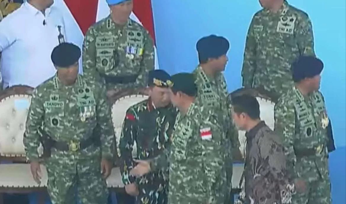 SBY tampak menyalami sejumlah petinggi TNI, namun terkesan melewati Kapolri yang berdiri di depannya.