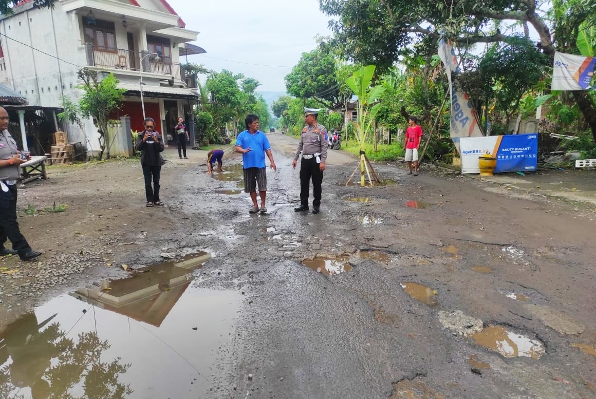 Petugas dari Unit Kamsel Satlantas Polres Trenggalek turun tangan tinjau kondisi jalan rusak Ngetal-Gandusari, Senin (17/2/2025).